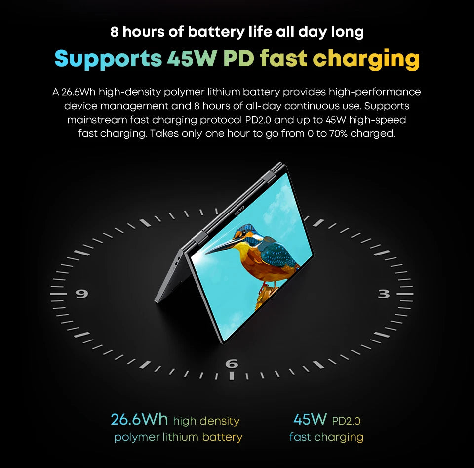 A 26.6Wh high-density polymer lithium battery provides high-performancedevice management and 8 hours of all-day continuous use. Supportsmainstream fast charging protocol PD2.0 and up to 45W high-speeofast charging. Takes only one hour to go from 0 to 70% charged.