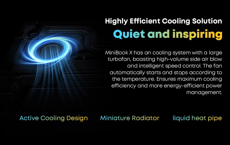 MiniBook X has an cooling system with a largeturbofan, boasting high-volume side air blowand intelligent speed control. The fanautomatically starts and stops according tothe temperature. Ensures maximum coolingefficiency and more energy-efficient powermanagement