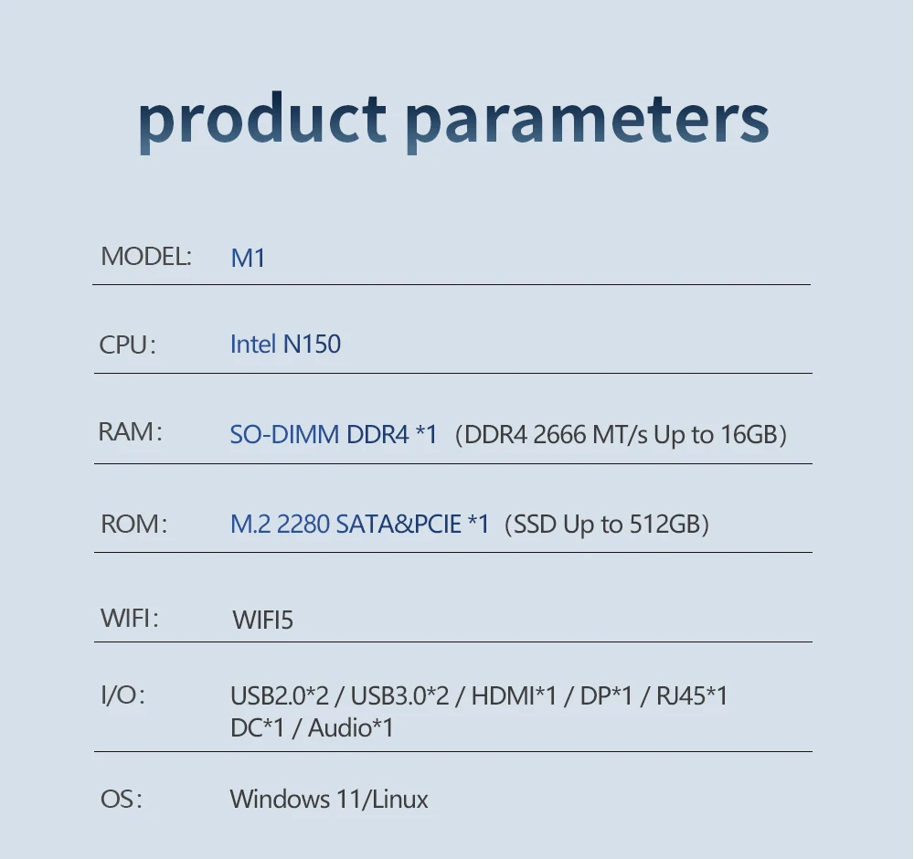 ● CPU: Intel Twin Lake N150, 4 Core 4 threads, 0.8GHz up to 3.6GHz, 6MB Cache