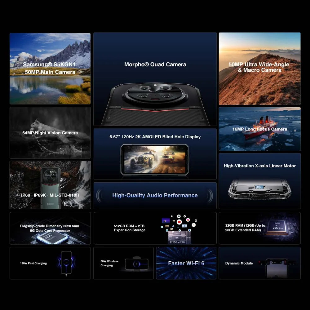 DOOGEE DK 10 Rugged Phone 6.67" 120Hz 2K AMOLED Display 12GB RAM 512GB ROM 50MP Main Camer Dimensity 8020 5G 120W Fast Charge