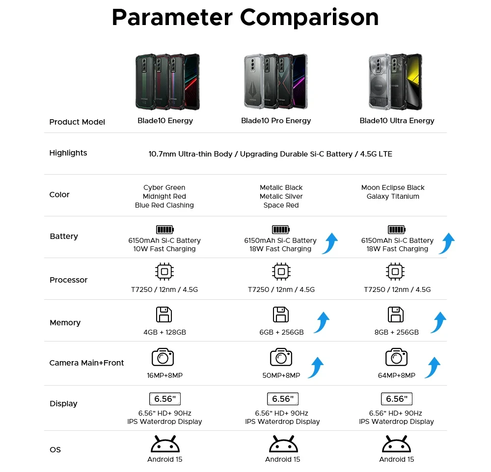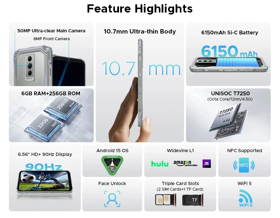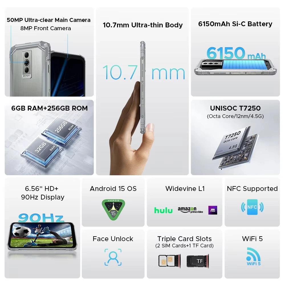 10.7mm Ultra-thin Body | 6150mAh Si-C Battery UNISOC T7250 | Android 15 OS | 50MP Ultra-clear Main Camera 6GB RAM+256GB ROM | 6.56'' HD+ 90Hz Display | Widevine L