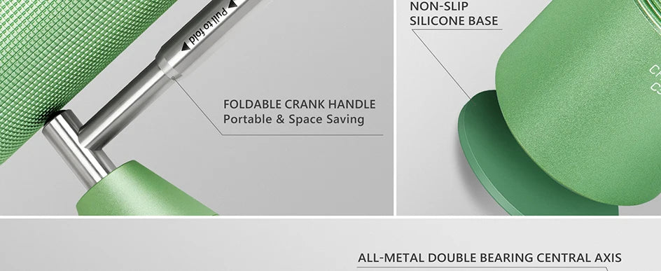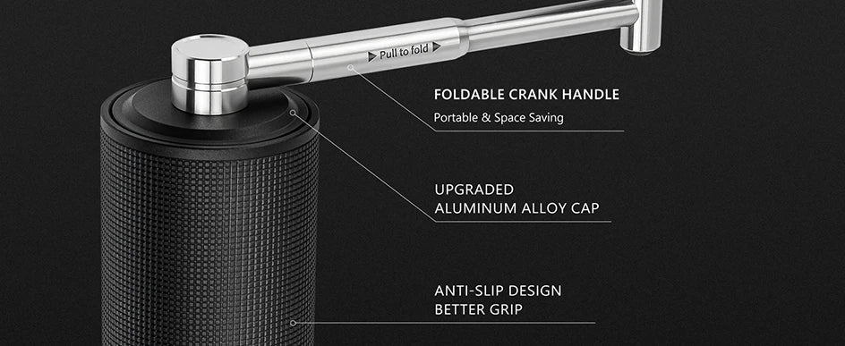 • FOLDABLE HANDLE: The PRO-serie coffee grinder is design with an unique patented spring-assisted handle, which when folded down against the body, prevents the grinder from being tipped over and makes it easy to store anywhere from your countertop to suitcase.