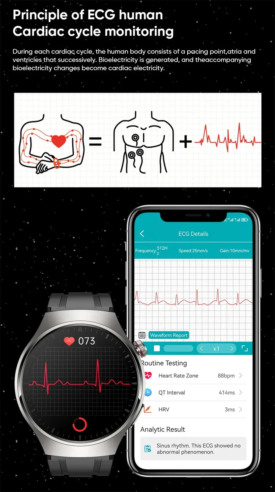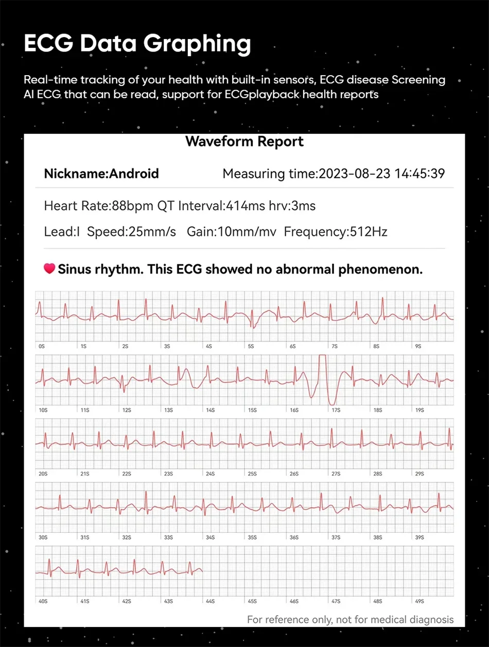 2. Electrocardiogram, ECG+PPG (electrode+photoelectric) testing for heart rate/electrocardiogram/blood pressure. (Generate ECG report HRV report, ECG playback)